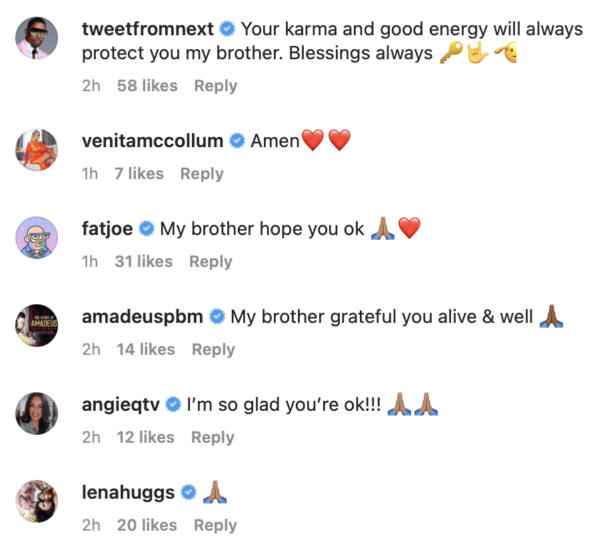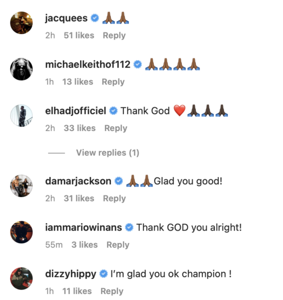 The “Where I Wanna Be” singer’s post was flooded with prayers and well wishes from his celebrity acquaintances. Mario Winans, Fat Joe, Jacquees, and others gave thanks that Jones was okay and made sure to note they are keeping the songwriter in their prayers.