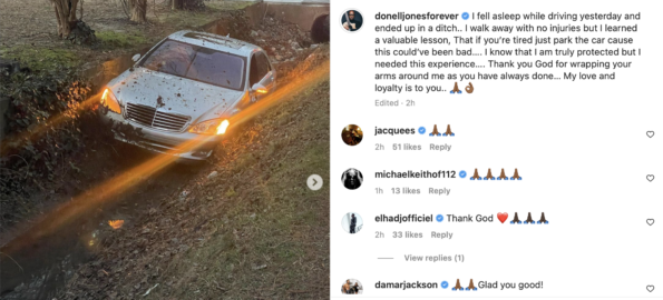 This morning (Jan. 10) singer Donell Jones shared a disturbing image of his car in a ditch as he admitted that exhaustion led him to an unfortunate situation. In his caption Donell Jones, 49, explained: