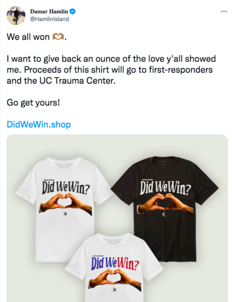 On Sunday (Jan.8) Hamlin tweeted that the shirts were a way for him to give back to the University of Cincinnati Medical Center. He shared that proceeds from the shirt will go to “first responders and the UC Trauma Center.”