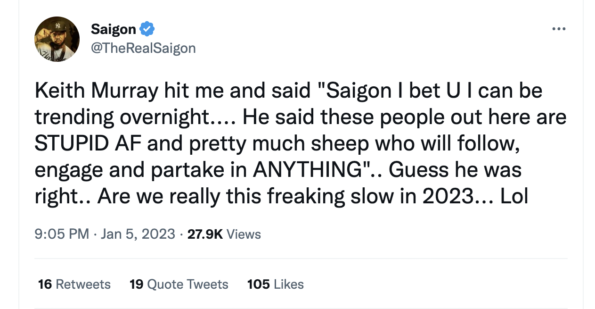 “Keith Murray hit me and said “Saigon I bet U I can be trending overnight…. He said these people out here are STUPID AF and pretty much sheep who will follow, engage and partake in ANYTHING”.. Guess he was right.. Are we really this freaking slow in 2023… Lol”