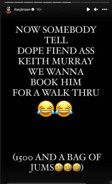 Foxy Brown previously blasted Keith Murray for his remarks by initially responding via her Instagram story, writing: