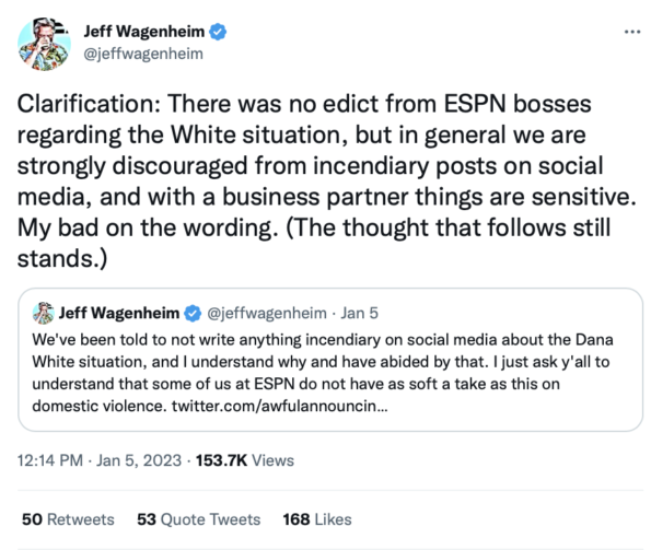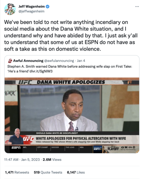 “We’ve been told to not write anything incendiary on social media about the Dana White situation, and I understand why and have abided by that. I just ask y’all to understand that some of us at ESPN do not have as soft a take as this on domestic violence.”