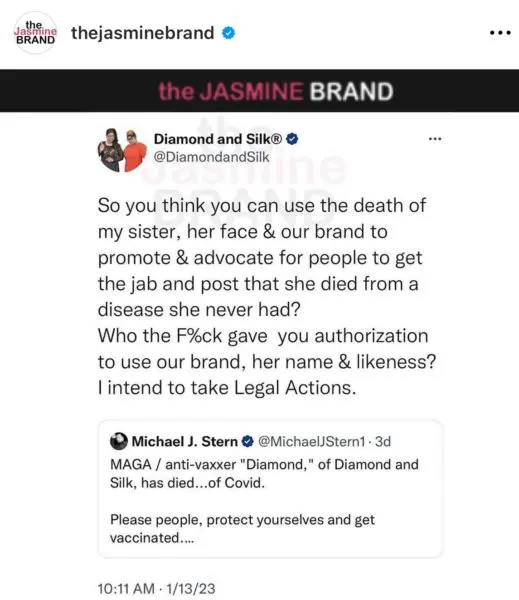 “So you think you can use the death of my sister, her face & our brand to promote & advocate for people to get the jab and post that she died from a disease she never had? Who the F%ck gave you authorization to use our brand, her name & likeness? I intend to take Legal Actions.”