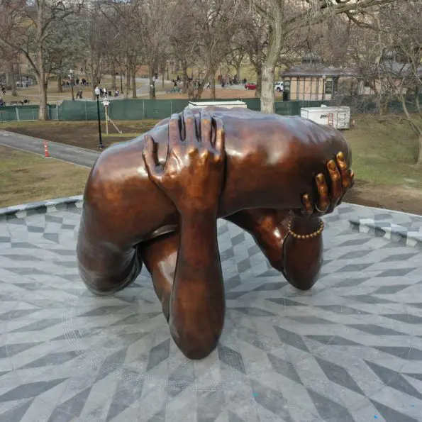 “The Embrace,” by artist Hank Willis Thomas, was inspired by a famous photo which showed Martin Luther King Jr. and Coretta Scott King hugging after he learns he won the Nobel Peace Prize in 1964. The sculpture focuses on the spouses’ intertwined arms without their heads, which has sparked criticism and mockery online.