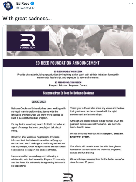 Ed Reed was notified by Bethune-Cookman that he will no longer be the Head Coach.