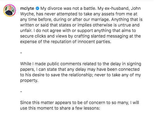 “My divorce was not a battle. My ex-husband, John Wyche, has never attempted to take any assets from me at any time before, during or after our marriage. Anything that is written or said that states or implies otherwise is untrue and unfair. I do not agree with or support anything that aims to secure clicks and views by crafting slanted messaging at the expense of the reputation of innocent parties.”
