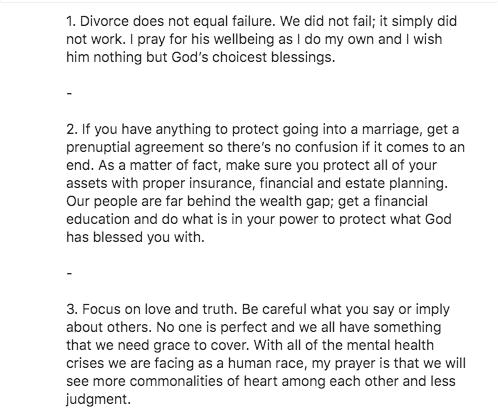 “1. Divorce does not equal failure. We did not fail; it simply did not work. I pray for his well-being as I do my own and I wish him nothing but God’s choicest blessings.