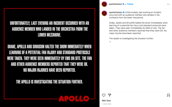 “Drake, Apollo and SiriusXM halted the show immediately when learning of a potential fan injury and standard protocols were taken. They were seen immediately by EMS on site. The fan and other audience members reported that they were OK. No major injuries have been reported.”