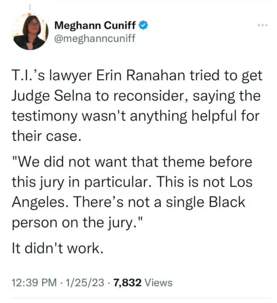 “T.I.’s lawyer Erin Ranahan tried to get Judge Selna to reconsider, saying the testimony wasn’t anything helpful for their case. “We did not want that theme before this jury in particular. This is not Los Angeles. There’s not a single Black person on the jury.” It didn’t work.”