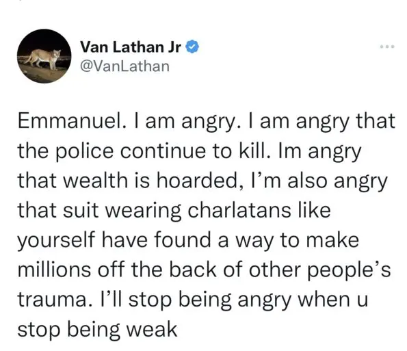 “Emmanuel. I am angry. I am angry that the police continue to kill. Im angry that wealth is hoarded, I’m also angry that suit wearing charlatans like yourself have found a way to make millions off the back of other people’s trauma. I’ll stop being angry when u stop being weak.”