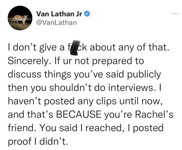 “I don’t give a f*ck about any of that. Sincerely. If ur not prepared to discuss things you’ve said publicly then you shouldn’t do interviews. I haven’t posted any clips until now, and that’s BECAUSE you’re Rachel’s friend. You said I reached, I posted proof I didn’t.”