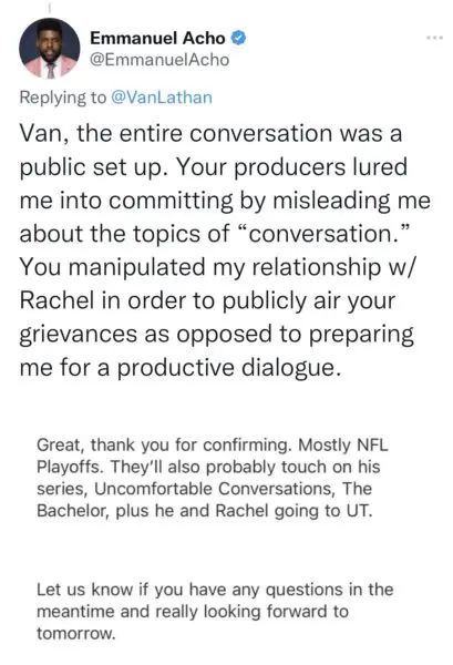 “Van, the entire conversation was a public set up. Your producers lured me into committing by misleading me about the topics of “conversation.” You manipulated my relationship w/ Rachel in order to publicly air your grievances as opposed to preparing me for a productive dialogue.”