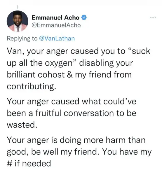 “Van, your anger caused you to “suck up all the oxygen” disabling your brilliant cohost & my friend from contributing. Your anger caused what could’ve been a fruitful conversation to be wasted. Your anger is doing more harm than good, be well my friend. You have my # if needed.”