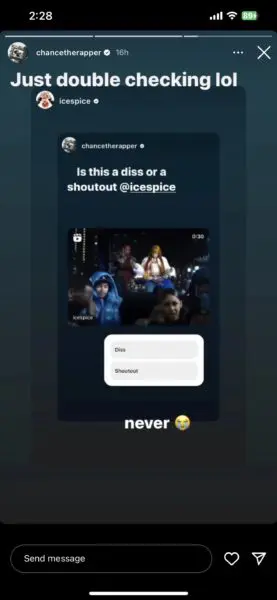 Chance The Rapper wasted no time and took to Instagram to ask Ice Spice if the line was a diss towards him or simply a way of showing him some love. In his Instagram Story, Chance asked,