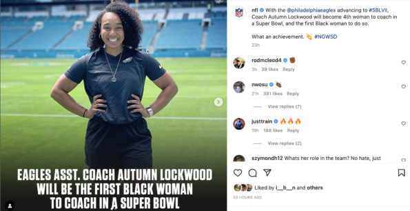 “With the @philadelphiaeagles advancing to #SBLVII, Coach Autumn Lockwood will become 4th woman to coach in a Super Bowl, and the first Black woman to do so. What an achievement. #NGWSD”