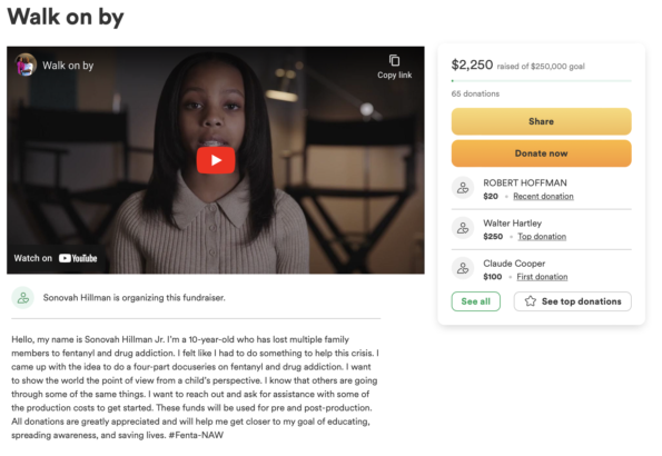 “Hello, my name is Sonovah Hillman Jr. I’m a 10-year-old who has lost multiple family members to fentanyl and drug addiction. I felt like I had to do something to help this crisis. I came up with the idea to do a four-part docuseries on fentanyl and drug addiction. I want to show the world the point of view from a child’s perspective. I know that others are going through some of the same things. I want to reach out and ask for assistance with some of the production costs to get started. These funds will be used for pre and post-production. All donations are greatly appreciated and will help me get closer to my goal of educating, spreading awareness, and saving lives. #Fenta-NAW”