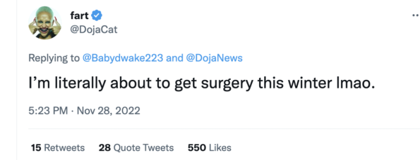 She shared the news in December after a fan page (Doja Cat News) tweeted a quote from the rapper regarding what they perceived as her reasons for not receiving any cosmetic surgery. The “Woman” rapper said,