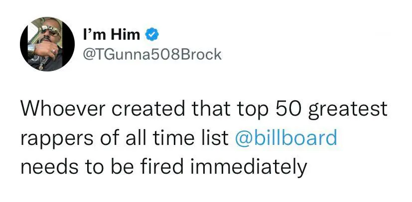 “Whoever created that top 50 greatest rappers of all time list needs to be fired immediately.”