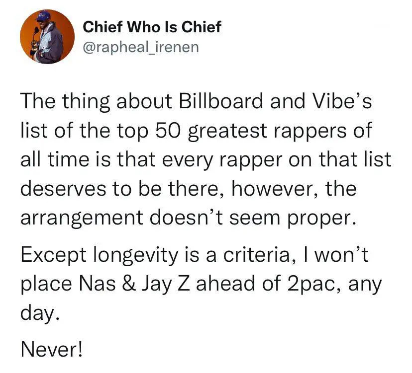 “However, the arrangement doesn’t seem proper. Except longevity is a criteria, I won’t place Nas & Jay Z ahead of 2pac, any day.”