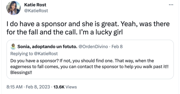 While reflecting on her mistake, Katie gave herself a pat on the back for how quickly she was able to “bounce back” and how she reached out to her sponsor without hesitation.
