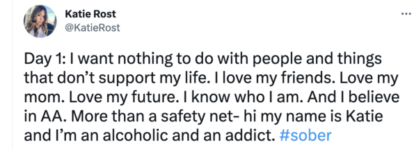 “Day 1: I want nothing to do with people and things that don’t support my life. I love my friends. Love my mom. Love my future. I know who I am. And I believe in AA. More than a safety net- hi my name is Katie and I’m an alcoholic and an addict. #sober”