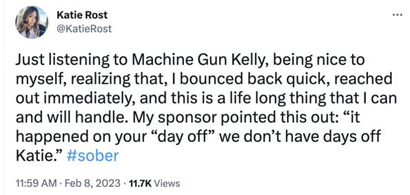 “Just listening to Machine Gun Kelly, being nice to myself, realizing that, I bounced back quick, reached out immediately, and this is a life long thing that I can and will handle. My sponsor pointed this out: “it happened on your “day off” we don’t have days off Katie.” #sober”