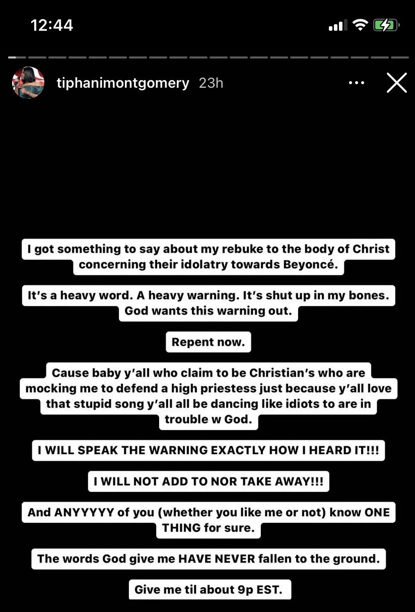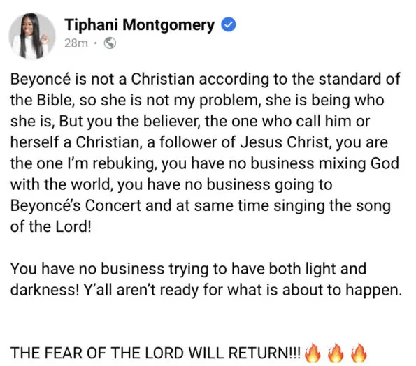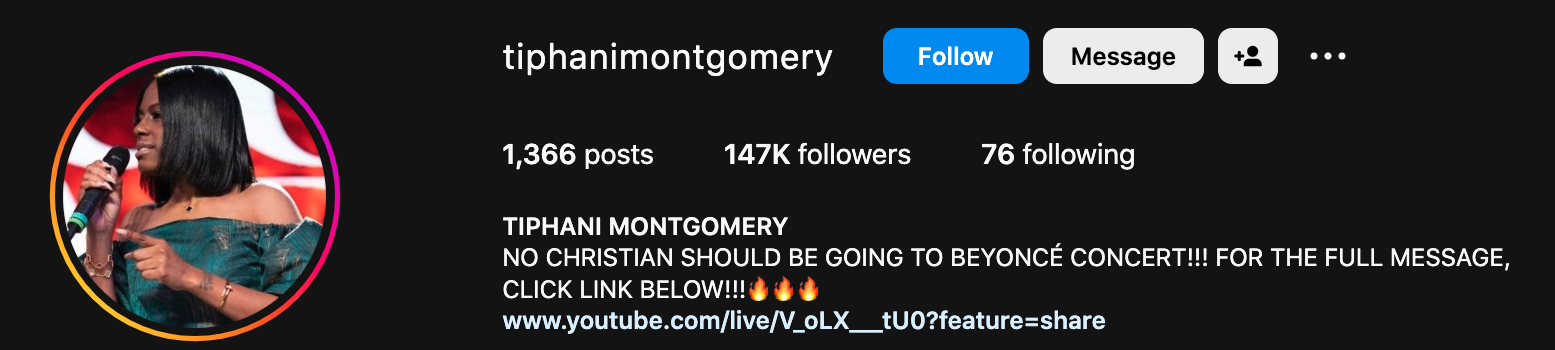 Montgomery went on to speak even more vehemently, labeling Beyoncé’s coming concert a “gateway” and claiming that all attendees will be ritual participants. In case she didn’t make her point perfectly clear, the spiritual leader doubled down on the message in her caption, bio, and with a few follow up posts.