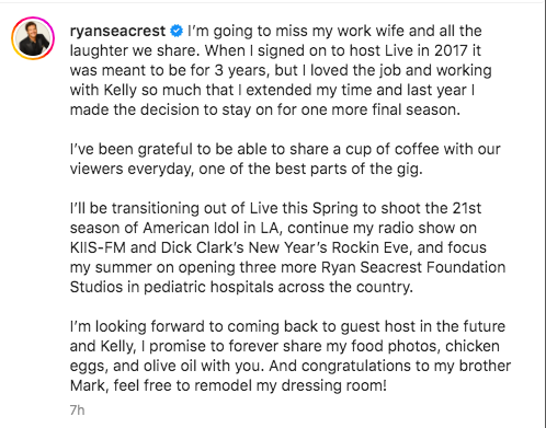 Ryan Seacrest also took to Instagram to share his future plans, and pay tribute to Kelly Ripa.