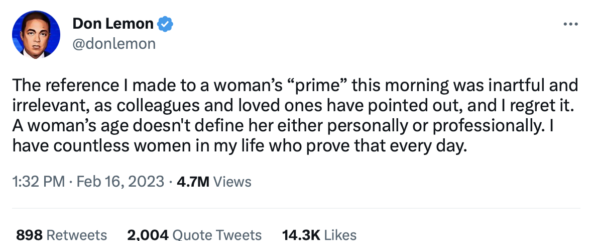 “The reference I made to a woman’s “prime” this morning was inartful and irrelevant, as colleagues and loved ones have pointed out, and I regret it. A woman’s age doesn’t define her either personally or professionally. I have countless women in my life who prove that every day.”