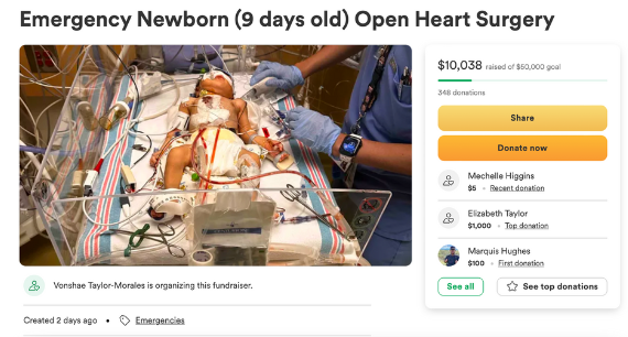 “At three days old our daughter was immediately transported to a children’s hospital that had a Cardiac Intensive Care Unit (CICU) to be stabilized and scheduled for open heart surgery on February 24, 2023. Upon completing the surgery the surgeon ran into a pulmonary hypertension issue with her lungs which has now left her chest open while sedated while they determine if a second surgery is needed.”