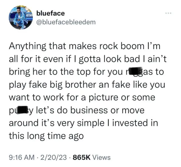 “Anything that makes rock boom I’m all for it even if I gotta look bad I ain’t bring her to the top for you n*ggas to play fake big brother an fake like you want to work for a picture or some p*ssy let’s do business or move around it’s very simple I invested in this long time ago”