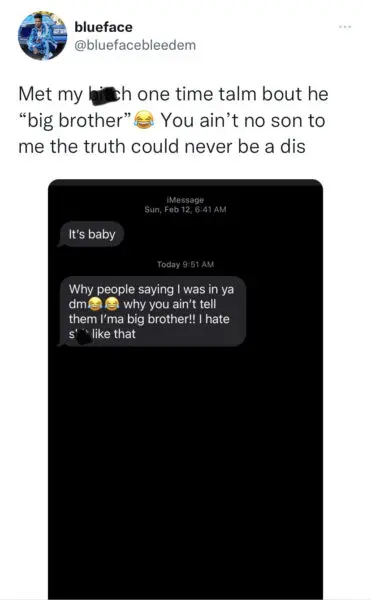 In a tweet, Blue shared an alleged text exchange between Chrisean and Lil Baby, with the 4PF rapper writing that he’s simply a “big brother” figure and was confused about rumors suggesting he had slid into her DMs. Blue started with,