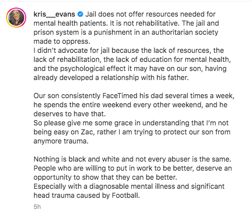 In an Instagram video shared on Tuesday (Feb. 28), Kristen Evans said she is against Zac Stacy going to jail because it would not provide him the resources he would need to get better and improve his mental health.