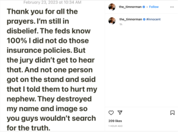 “Thank you for all the prayers. I’m still in disbelief. The feds know 100% I did not do those insurance policies. But the jury didn’t get to hear that. And not one person got on the stand and said that I told them to hurt my nephew. They destroyed my name and image so you guys wouldn’t search for the truth.”