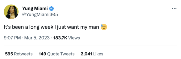 Sunday night (Mar. 5) Yung Miami — one-half of the City Girls — took to Twitter to announce that she is done sharing her man with other women. After killing the stage at Los Angeles’ Rolling Loud, Yung Miami wrote: