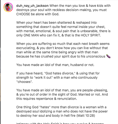 On Tuesday (March 7) morning, she posted an Instagram video of herself lip-synching along to gospel singer Koryn Hawthorne’s “Speak to me.” In addition to the video, Da’naia Jackson wrote a lengthy caption explaining how she’s gotten through the split from Derrick Jaxn, after four years of marriage. She started the caption with,