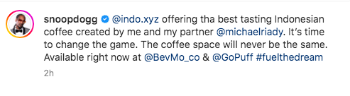 “@indo.xyz offering tha best tasting Indonesian coffee created by me and my partner @michaelriady. It’s time to change the game. The coffee space will never be the same.”