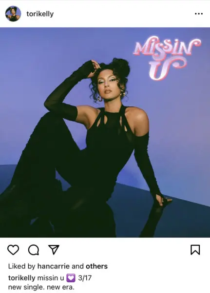 On Tuesday (March 7), the 30-year-old songstress took to her social media accounts to share the official cover art for her forthcoming song, “Missin U.” In the artwork, Tori Kelly (real name Victoria Loren Kelly) can be seen with a jet-black ‘do opposed to her famously blond curls.