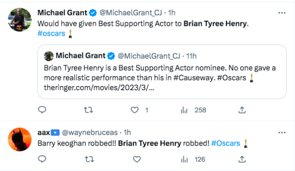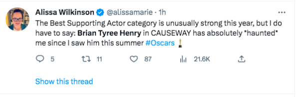“The Best Supporting Actor category is unusually strong this year, but I do have to say: Brian Tyree Henry in CAUSEWAY has absolutely *haunted* me since I saw him this summer.”