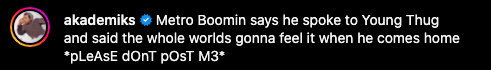 “Metro Boomin says he spoke to Young Thug and said the whole worlds gonna feel it when he comes home
