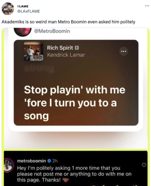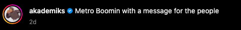However, it seems the Youtuber was not all inclined to respond positively to the musician’s plea. Akademiks reposted Metro’s comment on his social page with the response: