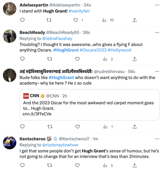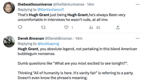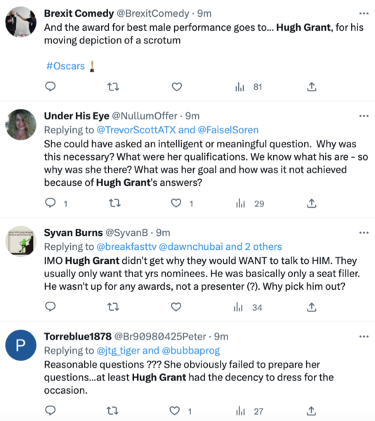 Hugh Grant should’ve been awarded an Oscar for “most awkward red carpet interview.”