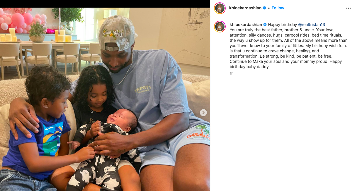 “Happy birthday [Tristan Thompson], You are truly the best father, brother & uncle. Your love, attention, silly dances, hugs, carpool rides, bed time rituals, the way u show up for them.”