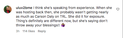 “I think she’s speaking from experience. When she was hosting back then, she probably wasn’t getting nearly as much as Carson Daly on TRL. She did it for exposure. Thing’s definitely are different now, but she’s saying don’t throw away your blessings!!”