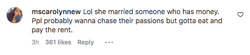 “Lol she married someone who has money. Ppl probably wanna chase their passions but gotta eat and pay the rent.”