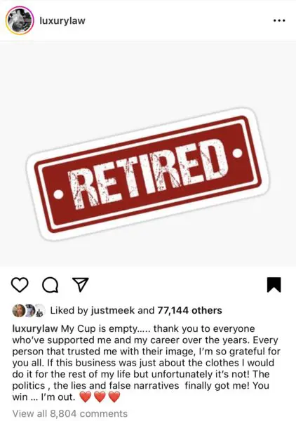 Law Roach posted a photo of the word “retired” and wrote: