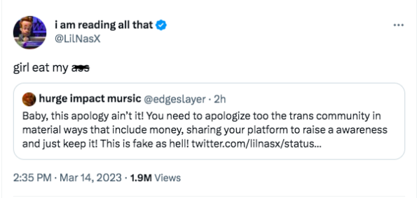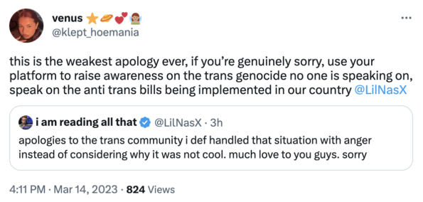 so once again @LilNasX responding with spite and vitriol instead of engaging with the very valid criticism coming from an actual trans person. AND is cool with your fans harassing and sending threats to a Black trans woman who named the ways your apology fell short. okay https://t.co/fLM2wUnL18 pic.twitter.com/aDyyyNZ2Hk