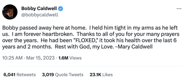 On Wednesday (Mar. 15) Mary Caldwell, Bobby’s wife of 19 years, took to his Twitter to announce his death to his fans. She wrote: