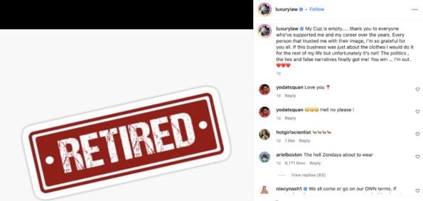 His original message came with a plain photo with large red letters that spelled out the word “RETIRED.” He gave a general thank you message to everyone that let him style them. But then hinted at the reason why he was stepping away from the world of fashion. He wrote,