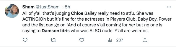 “All of y’all that’s judging Chloe Bailey really need to s*fu. She was ACTING! Oh but it’s fine for the actresses in ‘Players Club,’ ‘Baby Boy,’ ‘Power’ and the list can go on! And of course y’all coming for her but no one is saying [anything] to Damson Idris who was ALSO nude. Y’all are weirdos.”